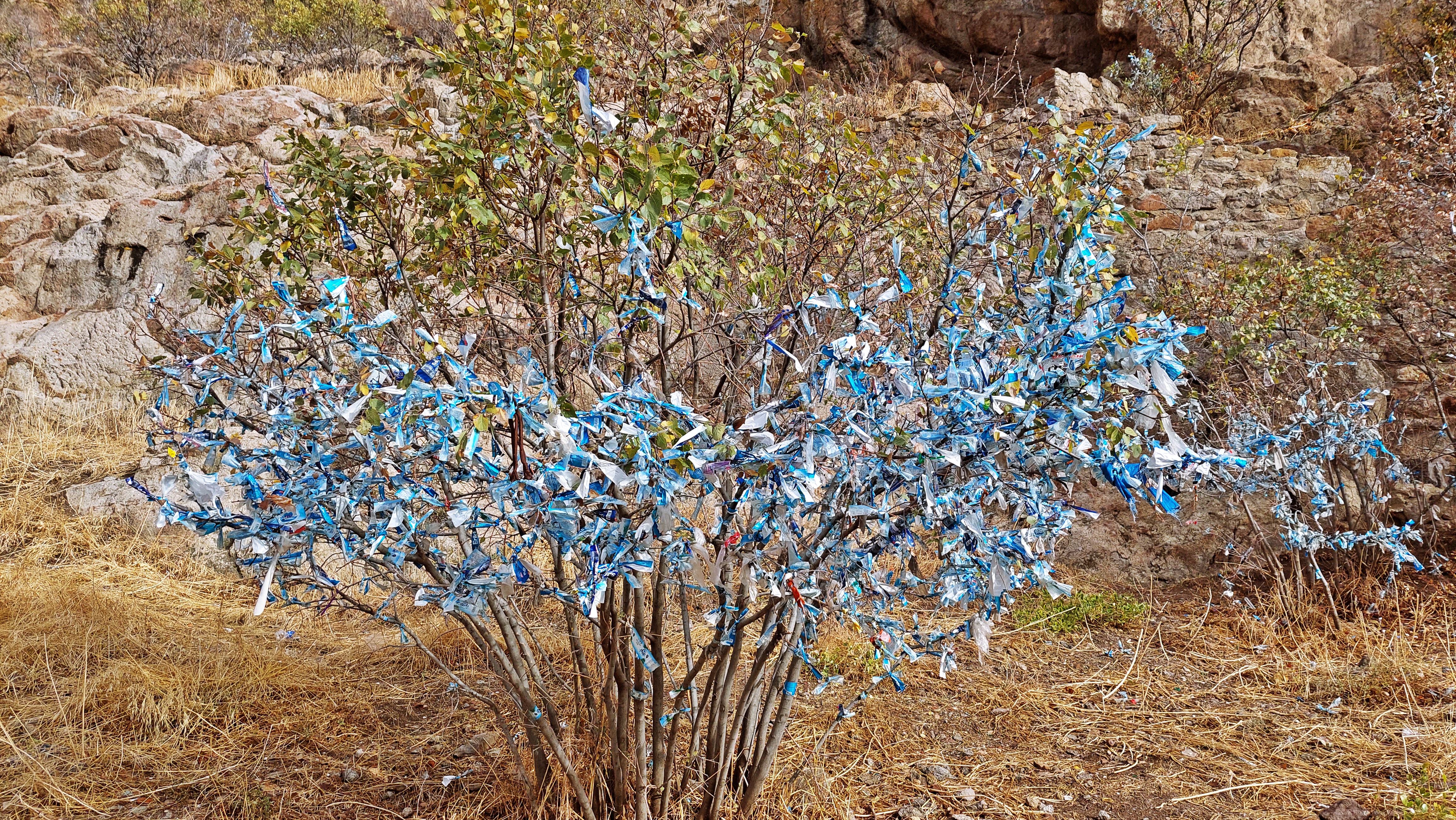 ağaçlara pet şişelerin etiketleri bağlanmış ne alaka bilemedim